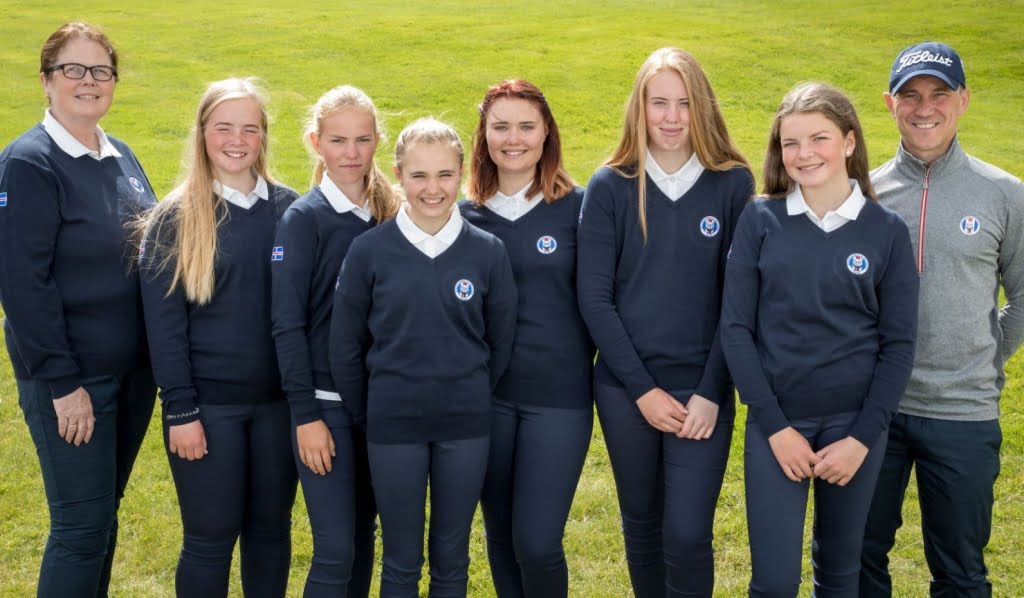 Frá vinstri: Þorbjörg Gunnarsdóttir liðsstjóri. Amanda Bjarnadóttir, Andrea Bergsdóttir, Kinga Korpa, Zusanna Korpak, Andrea Ásgrímsdóttir, Hulda Clara Gestsdóttir, Jussi Pitkanen landsliðsþjálfari