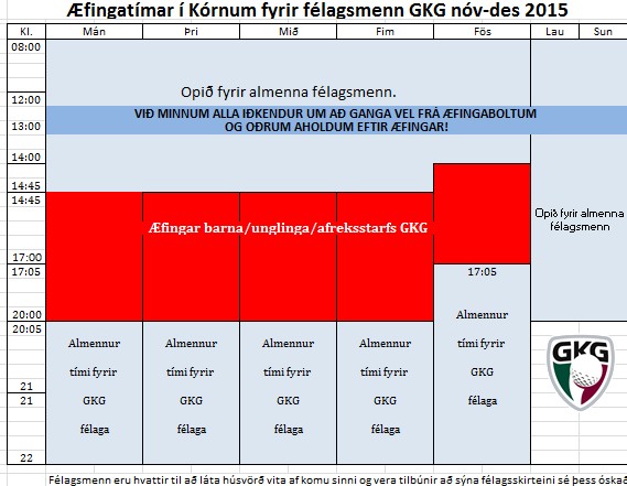 Við viljum benda á að æfingaaðstaða GKG er opin í Kórnum fyrir félagsmenn og hvetjum við alla til að nýta sér hana og æfa vel núna og koma vel undirbúin til leiks í vor.