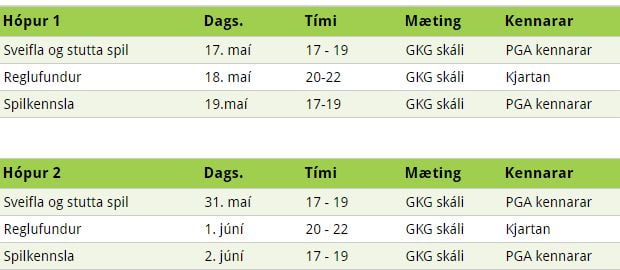 Skráning á nýliðanámskeið GKG er hafin, en þessi námskeið eru ætluð nýjum félögum sem eru að stíga fyrstu skrefin í golfinu og hafa ekki fengið forgjöf. Nýjir félagar sem koma úr öðrum klúbbum og hafa fengið forgjöf eða áður tekið þátt á nýliðanámskeiði á vegum golfklúbbs, þurfa ekki að taka námskeiðið. Gjald per þátttakanda er kr. 7.000 og er innifalið í því tæknikennsla, spilkennsla og reglufræðsla samkvæmt neðangreindu skipulagi, auk námskeiðsgagna. Auk þessa fá þátttakendur fræðslu um almenna starfsemi GKG og golfvelli félagsins, og notkun golf.is vegna skráningu rástíma og utanumhalds um forgjöf.